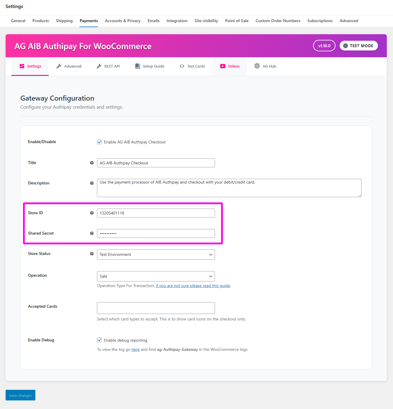 The AIB Merchant Services team will send you two emails for the test account, one with the Store ID and another with a Shared Secret for the connection. Once you have done several test orders, you can apply for the live Authipay account and set this up.