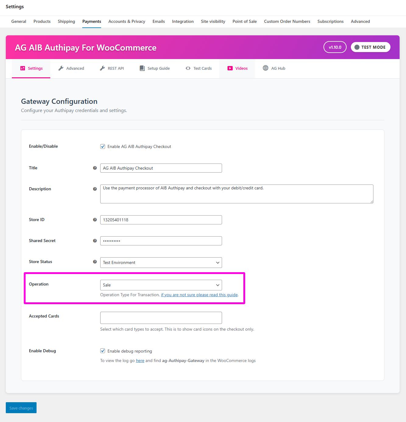 In this section, you will need to decide which operation mode you want to run the payment gateway. You will be able to set this option from the WordPress dashboard >>WooCommerce >> Settings >> Payments >> AIB Authipay Checkout Settings.