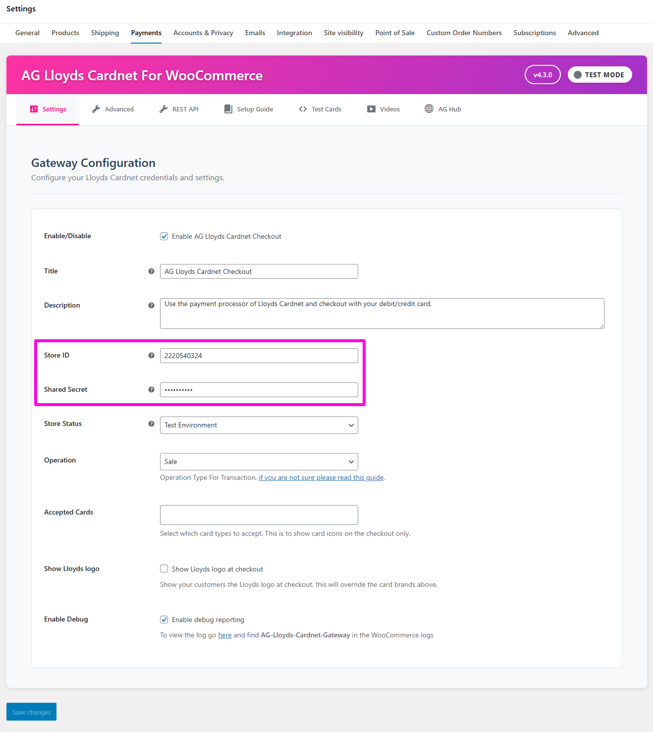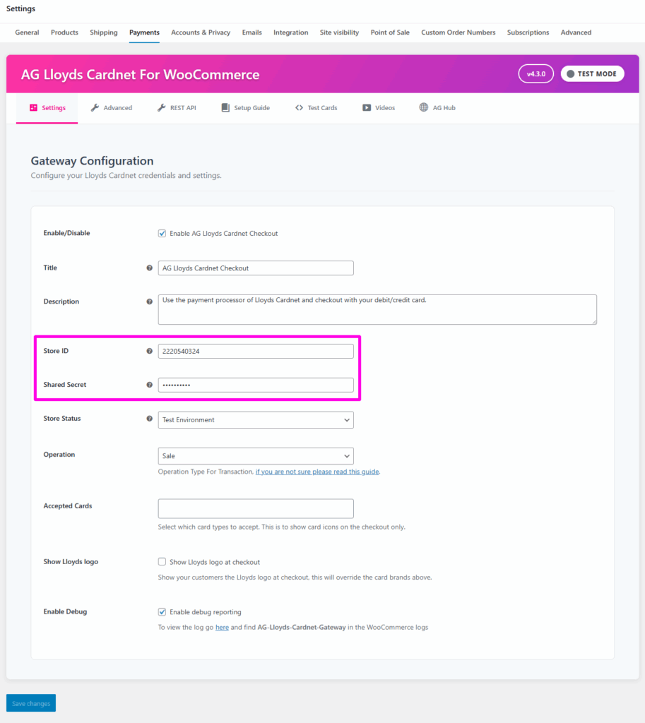 WooCommerce > Settings > Payments > AG Lloyds Cardnet Checkout Settings