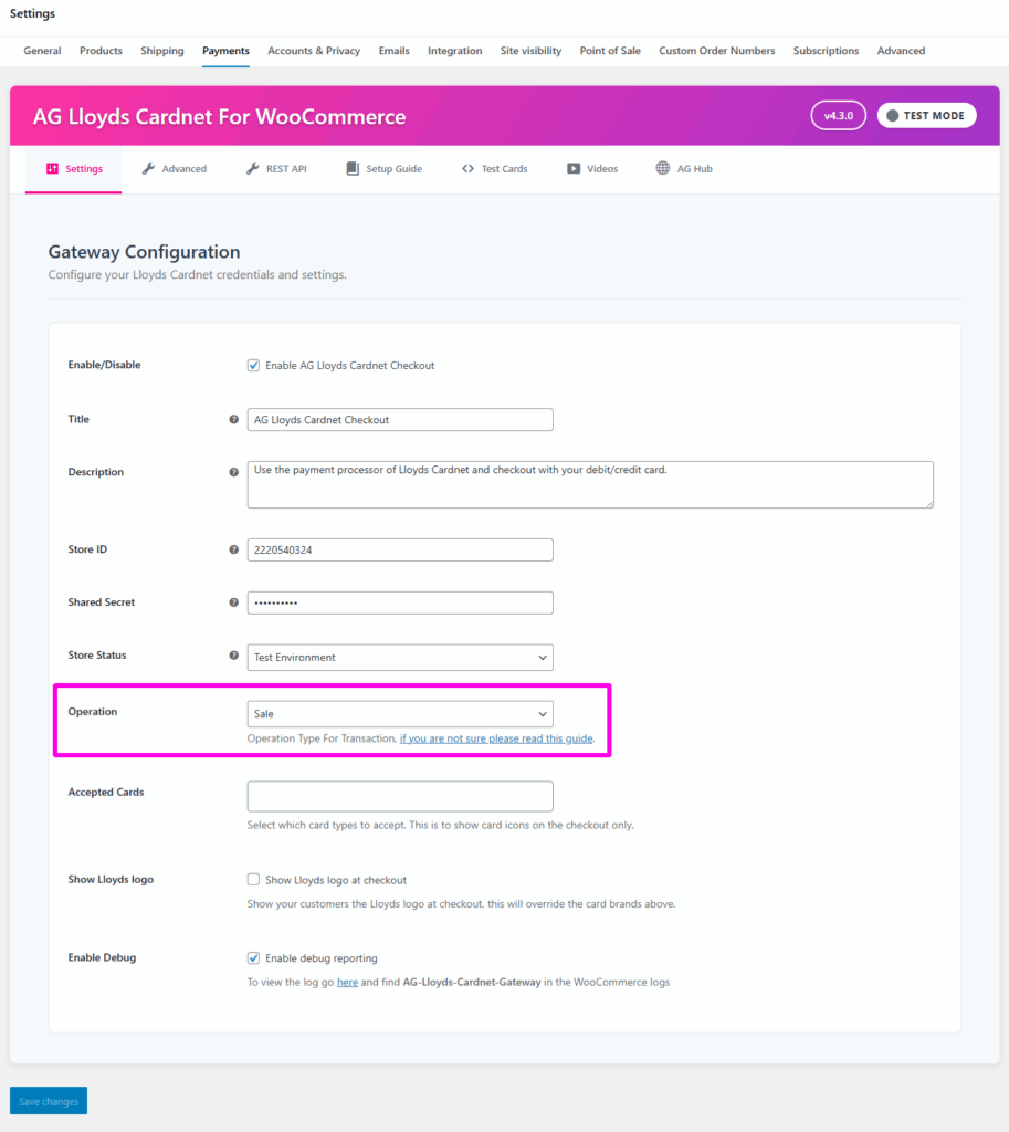 In this section, you will need to decide which operation mode you want to run the payment gateway. You will be able to set this option from the WordPress dashboard >> WooCommerce >> Settings >> Payments >> AG Lloyds Cardnet Checkout Settings.