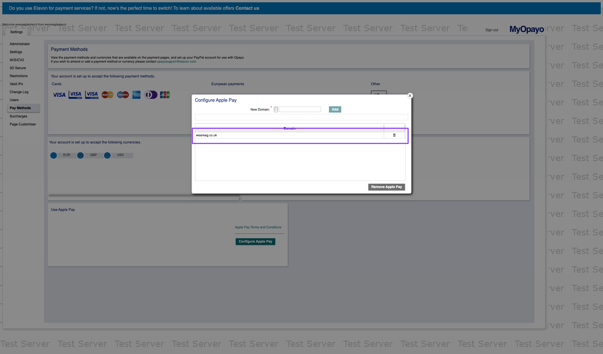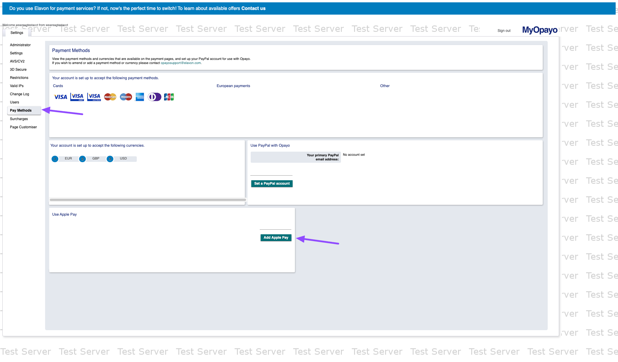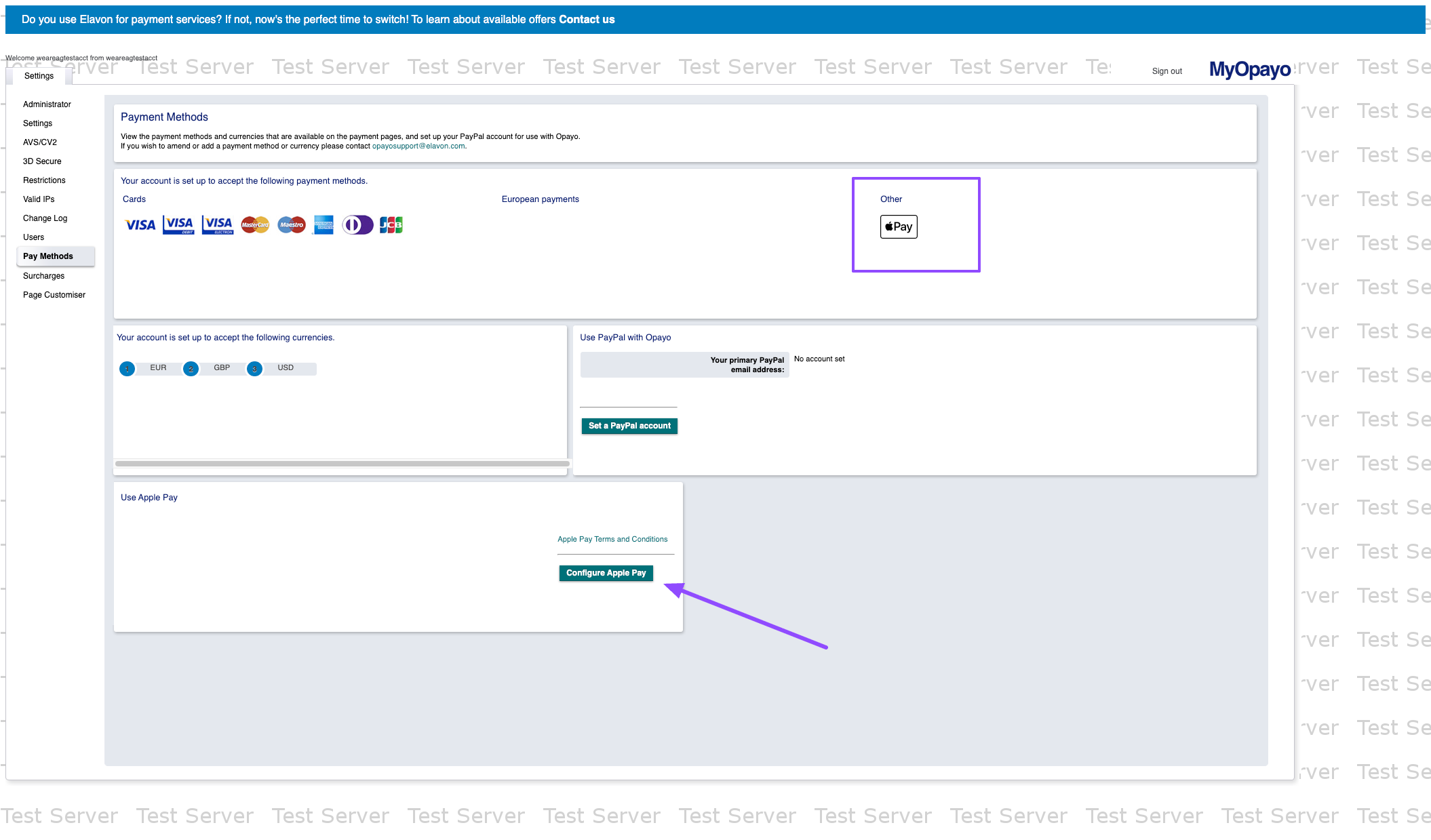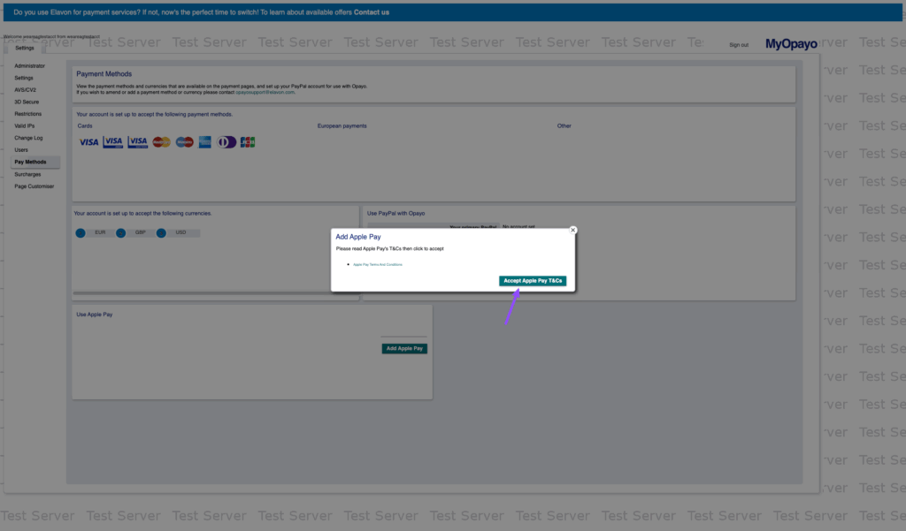 To enable Apple Pay in your Opayo account, follow the steps below.