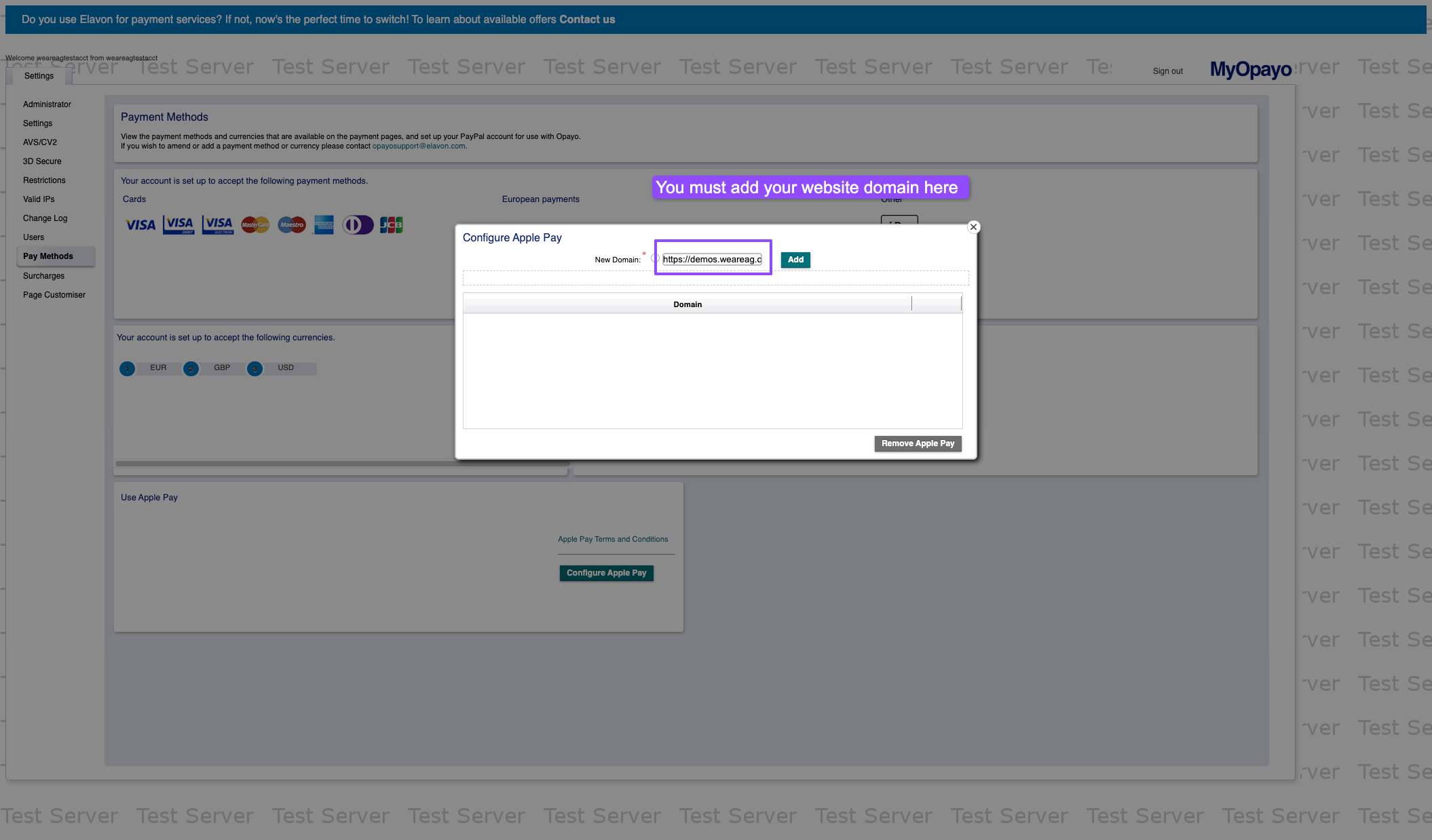 The live website domain is missing from the Apple Pay configuration in MyOpayo.